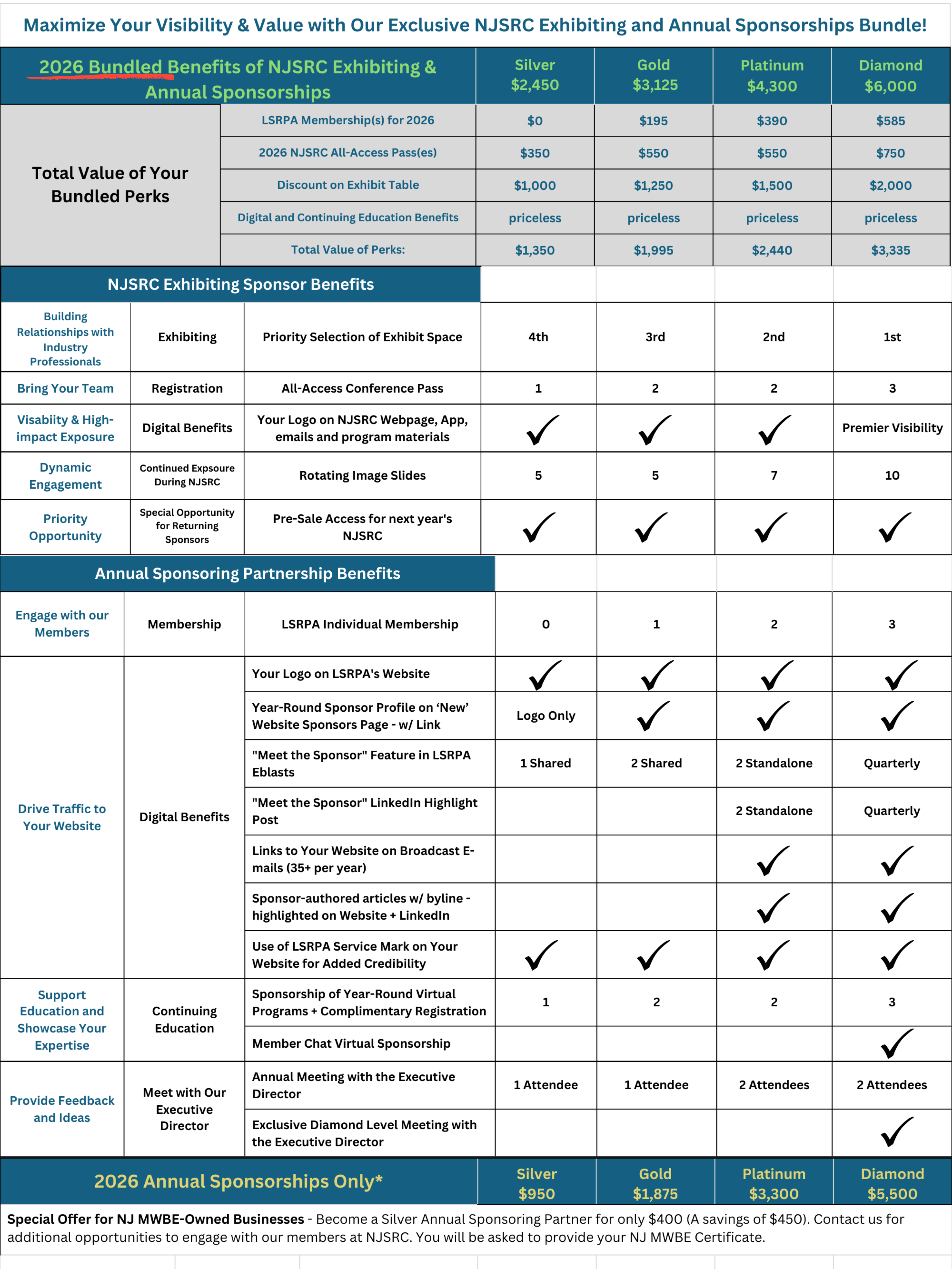 The chart below highlights the Annual Sponsorship benefits. You can also view them by clicking here. Remember, Annual Sponsorships are the only option currently open. If you’d like to be considered for an NJSRC exhibit space, we will reach out in January with next steps, as space allows.