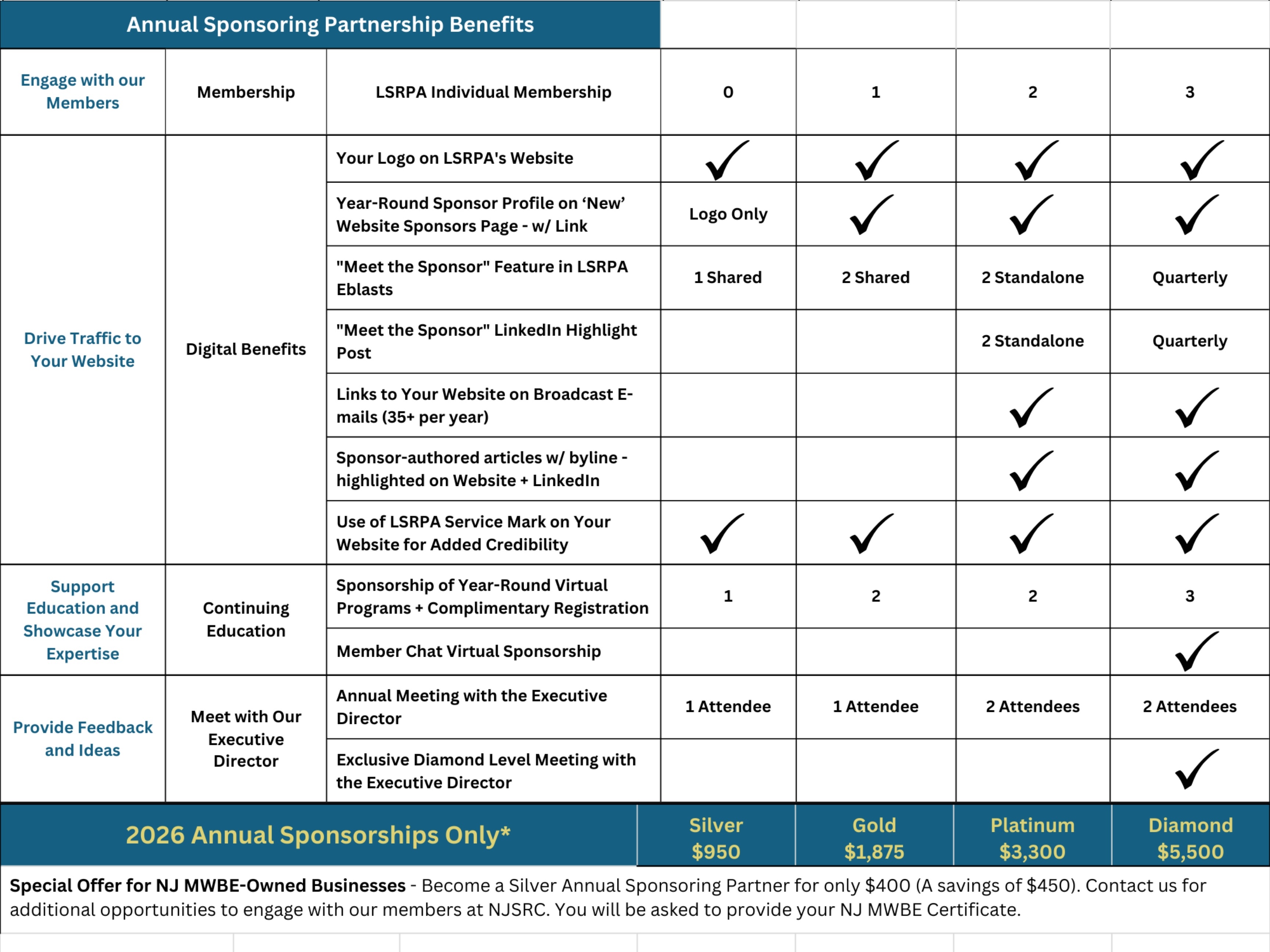 - Access to Leadership & Insight: Higher sponsorship tiers include strategic touchpoints with LSRPA leadership, offering a direct line for input, dialogue, and awareness of evolving regulatory and industry priorities. Diamond sponsors receive an exclusive additional Executive Director meeting.