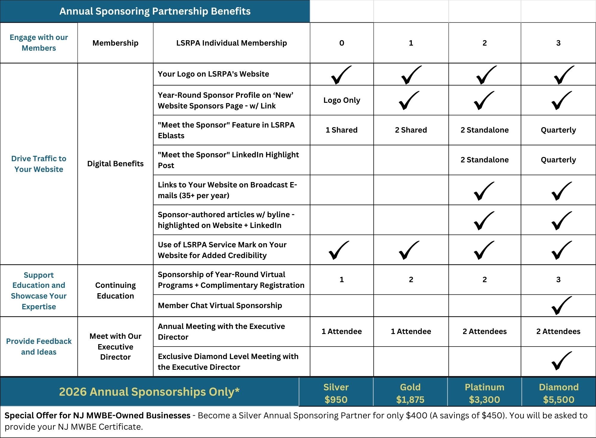 - Access to Leadership & Insight: Higher sponsorship tiers include strategic touchpoints with LSRPA leadership, offering a direct line for input, dialogue, and awareness of evolving regulatory and industry priorities. Diamond sponsors receive an exclusive additional Executive Director meeting.